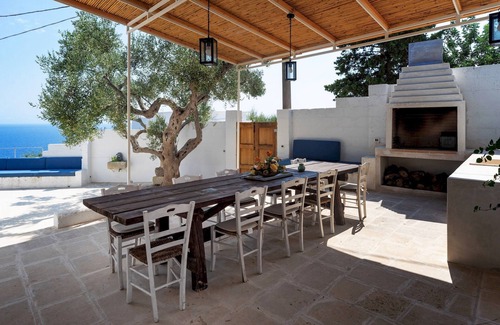 The wooden waterproof pergola next to the large barbecue features an outdoor kitchen and a grand wooden dining table that overlooks the ocean, ideal for alfresco dining. The pergola was custom-built to enable outdoor living in the Puglian sunshine while being protected from the elements. Above the barbecue area, a young aromatic herb garden (including rosemary, sage, lavender, thyme) fills the air with a delightful fragrance and provides fresh herbs for your cooking during your stay at Villa Adria.