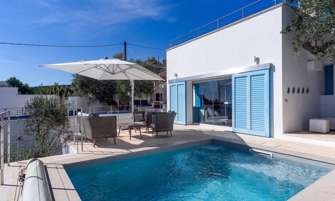 The swimming pool, with its ocean views, provides a refreshing escape during hot days. The pool is 3 by 4 meters in size, with a large shallow step that is perfect for children to stand on and adults to relax on while in the pool. It uses saltwater, which is gentler on the skin and eyes and promotes better physical and environmental wellbeing. The saltwater is sanitized through electrolysis, producing chlorine that kills bacteria. The two outdoor showers, nestled under the olive trees, offer a serene setting for rinsing off before using the swimming pool or after returning from the beach.