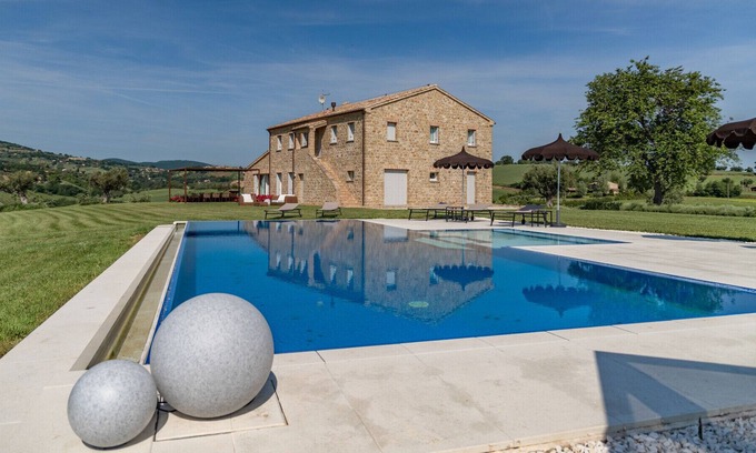 The complex of the villa comprises two buildings, the main villa and a charming annexe near the swimming pool, both of which have been completely restored in accordance with the ancient standards of a traditional farmhouse in the Marche region. The villa is composed of two floors, on the upper floor there are the 4 bedrooms, all with en-suite bathrooms, on the ground floor there is a kitchen of no less than 50 m² and outside there is a large pool in which to take a dip and relax with a stunning view.