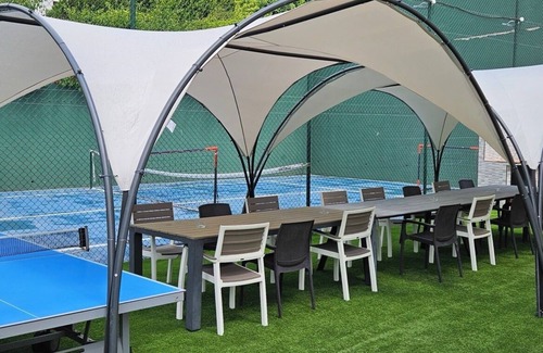 Your furnished private outdoor area includes a pool, a garden, 2 open terraces, 2 covered terraces, 6 balconies and a barbecue. Moreover, there is a sports area on the premises with a tennis and paddle court.