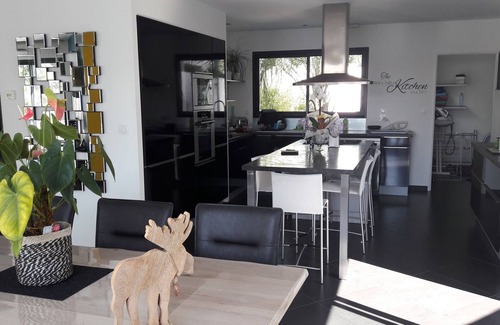 La cuisine est neuve avec un ilot central comprenant 5 places assises pour déjeuner. Elle est équipée de tout l'électroménager moderne et nécessaire (table induction, lave vaisselle, four, four micro ondes, Nespresso...).