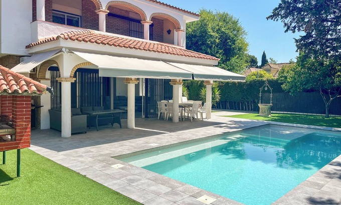 Luxurious 4 bedroom renovated private villa in the best residential area of Jerez. 850m2 plot and 350m2 house equipped with everything for a perfect stay. Heated salty pool, large terrace, big barbecue, extensive gardens, fruit trees and little traffic. One of the most exclusive accommodations in Jerez and an oasis of tranquility at only 7 min from the town center and 5 min from the Feria. Guests have the entire villa exclusively to themselves without sharing any space. We speak good English.