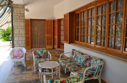 The porch is equipped with armchairs, sofa, 2 tables, one for 4 people and one for 12 people.