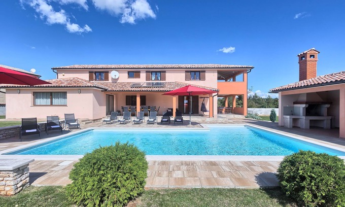 Spacious house in a quiet place ideal for larger families or groups. In front of the house there is a covered barbecue with seating and a large pool ideal for spending warm sunny days.