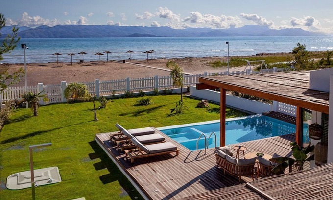 Beachfront Villa Ammos is a beachfront retreat nestled between the charming town of Lefkimmi and vibrant Kavos, set within a peaceful olive grove estate. This newly built, contemporary Ionian-style villa blends Aegean tones with high-end features, including a private swimming pool with jacuzzi, a luxury Hamman, and a stunning seafront deck for alfresco living. Ideal for relaxation, it offers two elegant king bedrooms and a stylish double sofabed, comfortably sleeping six guests.
