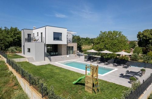 Beautiful and modern Villa Ani is located near famous Rabac which is known as a small touristic place with beautiful beaches. The Villa can accommodate up to 8 people.It has everything you need to feel completely carefree. It is fully fenced, has a large swimming pool with hydromassage (40 m2), a beautiful covered terrace with a dining table and a relaxation area. Outside are also a barbecue, slide, and badminton.The Villa Ani is divided into two floors. On the ground floor there is an open living room, kitchen with dining area, 1 bedroom and 1 toilet. On the first floor there are 3 bedrooms, each with its own bathroom. Also, 2 rooms have access to a balcony from which you can enjoy the beautiful view.It is a perfect destination to avoid summer hustle and a getaway from the noise and crowd. Also, location of the Villa is ideal for exploring Istria. At a distance of only 2 kilometers there are shop and a restaurant.We are sure that you would enjoying the tranquillity of the place, fresh air and relaxing by the private pool. Distances: post office 9100m, gas station 10000m, restaurant 2000m, shop 2000m, center 11400m, beach 10000m, airport 49000m.