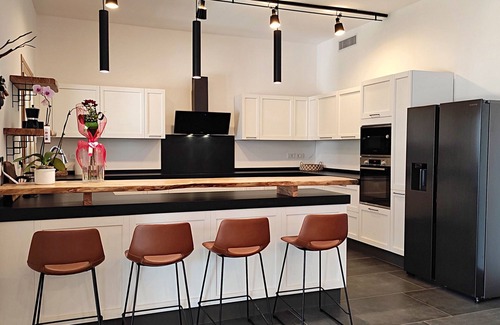 - A kitchenette with a comfortable peninsula, fully equipped with an induction hob, coffee pod machine, dishwasher, electric oven, and microwave.