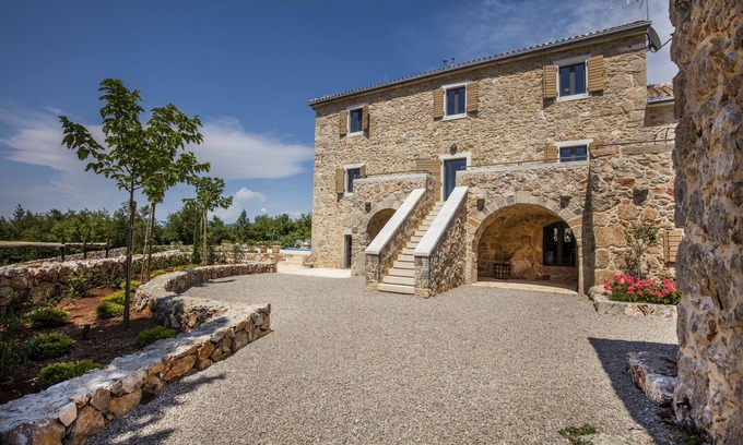 There is dining area with fully equipped kitchen and living room with an indoor fireplace at the ground floor. On the upper floors there are TV room with a Smart TV, and 5 bedrooms, each with its own bathroom. The private bathrooms have a bath or shower, free toiletries and a hair dryer. Guests can also use free private parking and free wi-fi. Covered terrace with barbecue, shady gazebo with charming view, sundeck near the infinity pool, will satisfy even the most demanding expectations. Here, we are sure, you will spend pleasant moments of relaxation.On request, the host can arrange car rentals, taxi services or bike rentals. The Island of Krk is famous for its network of bicycle and hiking trails, beautiful beaches and stunning views.