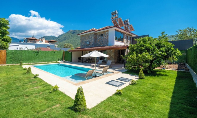 Offering a unique holiday experience in the enchanting nature of Fethiye Kayaköy, Villa Arıcan 2 for rent has an accommodation capacity of 4 people with its own pool, garden and 2 bedrooms. The pool and garden terrace of our villa, which is ideal for honeymooners, families and groups of friends who prefer conservative holidays, are designed in such a way that they are not visible from the outside.