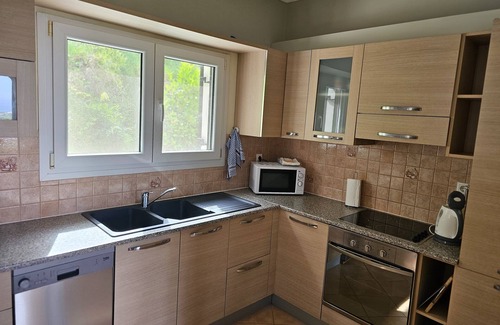 Peaceful villa with sea and mountain views, nestled in lush natural surroundings. Includes full amenities and cozy dining areas. Close to stunning beaches. Rent Armonia B for a scenic escape.
