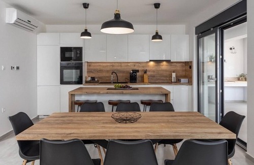 On the first floor of Villa Askim Prestige are three bedrooms (double beds) with en suite bathrooms with shower, two of which have a balcony with a beautiful view of the blue Adriatic. The ground floor has a separate toilet, bedroom with ensuite bathroom, modern functional kitchen with dining room with 8 seats and a bar with 3 seats, and a comfortable living room. All rooms in the villa are air-conditioned.