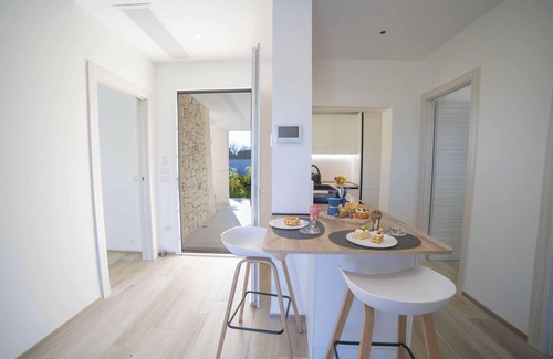 Surrounded by lush green landscape, this villa is perfect for families and groups looking for a relaxing yet luxurious accommodation near the sea. The villa features a comfortable living room with a double sofa and air conditioning. The kitchen is fully equipped with a Moka coffee machine, microwave, oven, fridge, and induction hob.