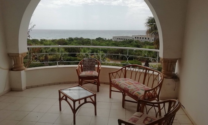 A floor of an independent villa for rent at Mansoura Kélibia la blanche beach in Tunisia, foot in the water (magnificent sea with transparent water), the villa is in a fenced and guarded residence, composed of 2 bedrooms, a spacious living room, a beautiful kitchen with dryer and two shower rooms. Furnished and air-conditioned house with a beautiful terrace.