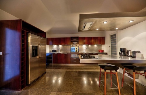 Designed with forethought and attention to detail, Villa AUM exemplifies chic comfort and clean lines, all accentuated by commissioned art from various artists and Asian decorative works. The kitchen is a high-tech masterpiece: a dramatic steel "floating" island holds the gas range-top, and plentiful counter space surrounds gourmet touches such as dual sinks and a Leibherr wine-storage unit.