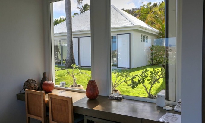 Step through the entrance to Villa AUM and you are greeted by pleasing expanses of green grass adjacent to a broad deck overlooking Marigot Bay and the vast blue of the Atlantic Ocean beyond. Located in the private, gated community of Mont Jean, Villa AUM offers its guests the perfect combination of exclusivity and ease. Just minutes from Saline Beach and the village of Lorient, AUM is convenient and yet blissfully secluded.