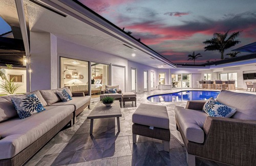 ●Elegant Alfresco Dining: A refined outdoor dining table for eight provides the ultimate setting for sunset dinners and festive gatherings, all with stunning views of the pool and waterway.