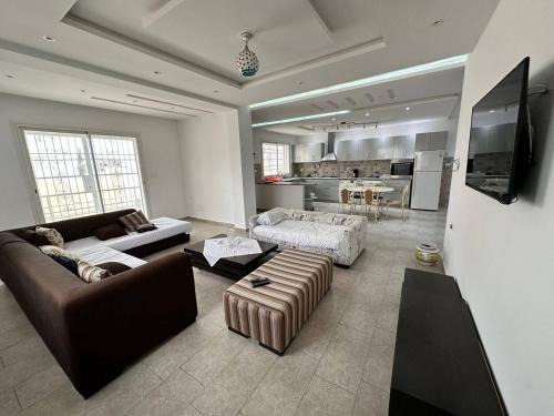 Providing a garden, Villa Azur offers accommodations in Ḩammām al Ghazzāz. This apartment provides air-conditioned accommodations with a terrace and free Wifi. The spacious apartment is composed of 2 bedrooms, a living room, a fully equipped kitchen, and 2 bathrooms. A flat-screen TV is provided. The accommodation is non-smoking. Ezzahra Beach is a 7-minute walk from the apartment. Tunis–Carthage Airport is 70 miles away.