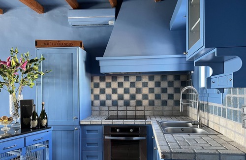 Villa Thera and Villa Azure are both arranged over two floors with two bedrooms and two bathrooms on the lower floor. Villa Thera sleeps up to five and Villa Azure up to four and if both houses are booked together can accommodate up to twelve people. Full air conditioning throughout both Villas and both with very fast internet through satellite connection giving with 200-300 Mbps for download. Both houses are equipped with Smart TVs (Internet, Bluetooth and Ethernet compatible),full kitchens, outside barbecues, three outside terraces and a small well planted gardens. Local supermarkets are in easy walking distance and they also provide a home delivery service.