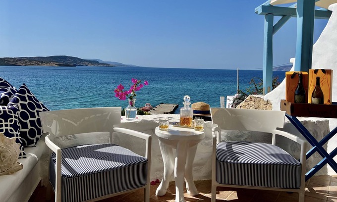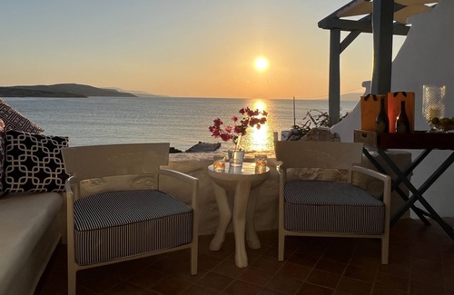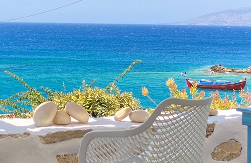 Idyllic, perfectly positioned Aegean island beach house in an elevated, sunset facing position, 10 metres directly above the beach. This perfect house on the west side of Koufonisi village with spectacular views has very easy and short walking access to all beaches, restaurants, bars, shops, gym, main harbour, night life and wonderful swimming directly in front of the house.