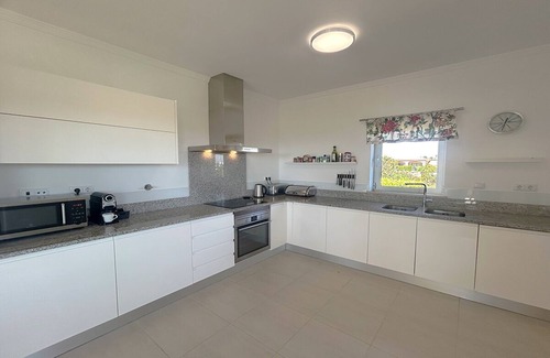 The front door opens onto the first floor of the villa, the living room is a large open space with an abundance of light, there is lounge seating for all the family and a dining table with 6 chairs, the smart TV offers a UK, German, Dutch and Portuguese TV service, as well as Netfix, Disney Plus, Amazon Prime etc... (own subscription required). The kitchen leads off from the living room, this is a well-equipped kitchen with large fridge freezer, dishwasher, coffee machine (loose coffee or pods), microwave and air-fryer. There is a small utility room off from the kitchen with a washing machine and tumble dryer. There is a small cloakroom on this level of the house with a toilet and basin.