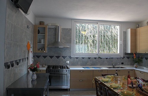You will be able to enter the kitchen from the corridor. The furnishings are modern and comfortable. It is well equipped, with a six-burner gas cooker, an electric oven, a refrigerator with freezer, a dishwasher, a microwave oven, an Italian-style coffee-maker, an American-style coffee-maker (bring your filters!), a toaster and a kettle. The dining table can accommodate 14 guests. The kitchen is also equipped with a flat-screen satellite television (local channels). From the kitchen a French door will take you to the patio. The room has a window with a view of the greenery, and is equipped with an air conditioning/heating unit.