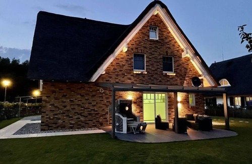 The swimming pool in the house is still available to our guests-- The villa is located in Rerik in the quiet Baltic Sea holiday park. The private wellness area with sauna and indoor pool (7.3 x 3.5m and 26°C water temperature) enables fun and relaxation around the clock, whatever the weather. On cool days, enjoy the cozy warmth of the gas fireplace in the spacious 60 sqm living-dining area. The large bedrooms upstairs all have air conditioning, smart TVs and Bluetooth soundbars. The two large bathrooms offer an exceptional bathroom standard (shower toilet, large bathtub, towel warmer, etc.). The almost 1000 square meter property, enclosed with a stone wall, invites you to play and relax. The glass roof means you can use the terrace even in bad weather.