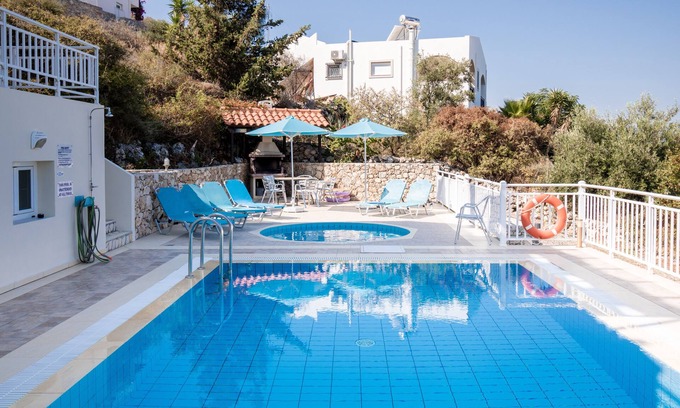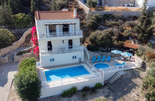 Nestled in the hillside above Souda Bay, Villa Bougainvillea offers a spectacular panoramic ocean view, two private outdoor swimming pools (1 adult pool L7xW4xD1.2 m and 1 childrens paddling pool D45 cm) and private gated drive with ample parking. Sleeps 7 plus cot.