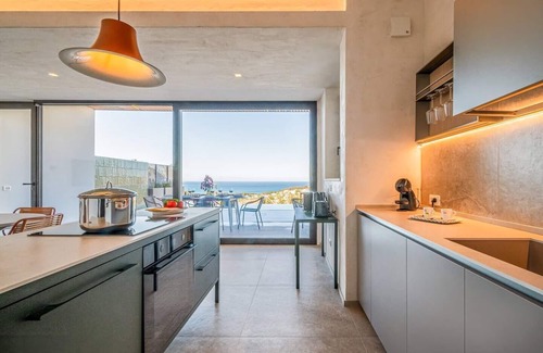Outside, the shaded veranda with a panoramic view is a true haven of peace, furnished with a large dining table for convivial dinners, comfortable sofas for relaxation, and a gas BBQ for unforgettable grilled meals. This space is perfect for admiring the stunning Mediterranean coast while enjoying the gentle sea breeze. The infinity pool, surrounded by elegant loungers, completes the outdoor area, inviting guests to unwind and soak up the Sicilian sun.