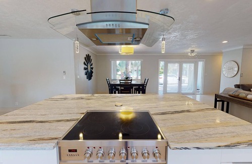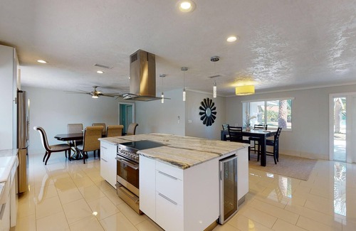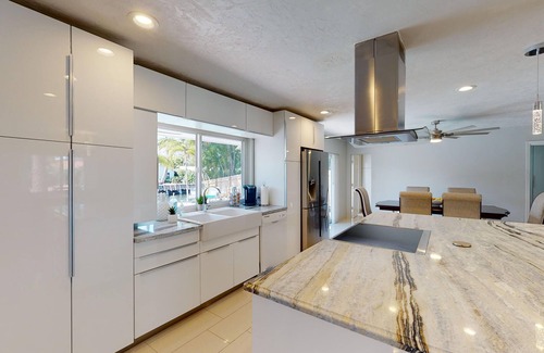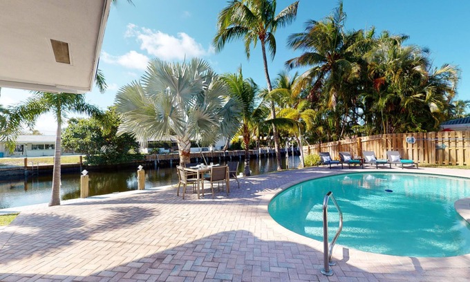 Modern elegance abounds in this Fort Lauderdale waterfront home. Spectacular for indoor and outdoor entertaining, this spacious open floor plan is perfectly situated to showcase majestic sunsets. The island kitchen and sophisticated stonework combine with porcelain floors for a luxurious relaxing vibe. Fabulously appointed Master Suite with king-size bed and sliders out to the pool area. We also have 2 guest rooms, one with a king-size bed, one with a queen-size bed, and a daybed for an extra guest. Outside take a refreshing dip in the crystal clear heated pool then work on your tan on one of the chaise lounges as you gaze over the spectacular view of the waterway. Later throw some steaks or shrimp skewers on the gas barbeque grill while enjoying your favorite beverage- this home also has an extra ice machine to keep things cold & refreshing in the hot weather. Watch your kids splash and play in the sparkling crystal-clear heated pool. This home is the perfect family vacation choice. Walk to outdoor restaurants, boutiques, and shops, and to the beach in Lauderdale by the Sea! This vacation home has everything you need to live The South Florida lifestyle!