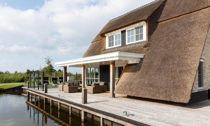 Stately Waterfront Villa with Spa-Like Comforts Step into this elegant villa on the edge of a tranquil park in Delfstrahuizen and experience unmatched luxury and design. With its grand facade and tasteful interiors, the home instantly impresses. The spacious ground floor features an open-plan living area with a cozy gas fireplace, a fully equipped modern kitchen, and a large dining space perfect for shared meals. The ambiance is warm and inviting, enhanced by sleek furnishings and natural light. Ideal for Large Groups & Ultimate Relaxation With five beautifully appointed bedrooms—one on the ground floor with a private sauna and en-suite bath—this villa is tailor-made for comfort. The four upstairs bedrooms include plush box-spring beds and smart TVs, ensuring restful nights for up to ten guests. Three additional bathrooms provide ample privacy, whether you're traveling with family or friends. Everything has been curated for convenience and luxury, right down to the wireless music system and heated floors. Private Jetty, Terrace Bliss & Local Delights Slide open the garden doors and step onto your private decked terrace, where cozy garden furniture and patio heating make it a year-round favorite. Unwind by the water or launch a boat from your own jetty. While pets aren’t allowed, guests can explore the serene lakefront, dine in charming nearby restaurants, or stroll through the idyllic village of Delfstrahuizen—all just moments away.