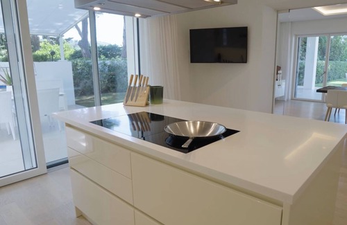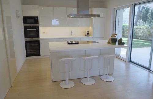 Offering 2 panoramic terraces, the spacious villa includes 5 bedrooms, a spacious living room with a fireplace, outdoor and indoor dining areas, 3 bathrooms with a walk-in shower and bidets, lastly a dependence with a bedroom, own bathroom, living room and kitchenette. All bedrooms and living rooms have Samsung flat-screen TVs. All spaces have individual air conditioning. The villa offers bed linen, towels and has its own laundry room with a Miele washer and dryer. Cleaning can be arranged upon request on a daily basis, depending on the guest's needs.