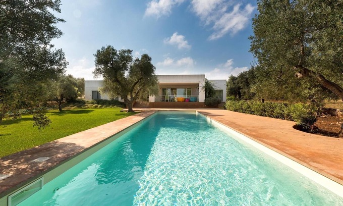 A swimming pool surrounded by olive trees, the sea and beaches of Torre Guaceto, the accessories of a modern house and the vivacity of the colors: this is Villa Carlita, a luxury holiday home for rent in the countryside of Carovigno, in the area of Brindisi, with air conditioning, wifi connection,