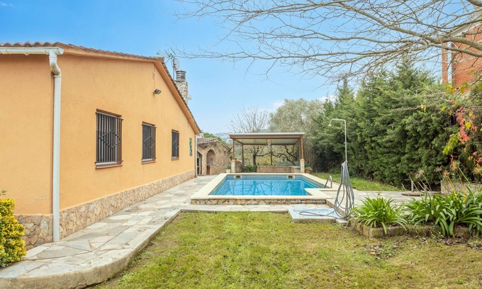 Boasting a beautiful view of the mountain, the villa Casa Raymond with step-free access and interior is located in Maçanet de la Selva. The 105 m² property consists of a living room with a sofa bed for 2 people, a kitchen, 3 bedrooms and 1 bathroom as well as an additional toilet and can therefore accommodate 8 people. Additional amenities include Wi-Fi, a TV, a fan as well as a washing machine. A baby cot is also available. This accommodation does not offer: air conditioning. Welcome to our vacation rental with an enticing private outdoor space. Take a refreshing dip in the pool, bask in the lush garden, unwind on the open terrace, find shade on the covered terrace, savor grilled delights on the barbecue, and rinse off in the outdoor shower.