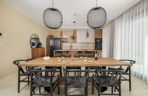 Inside, the open-concept living and dining area invites relaxation with cozy sofas, a flat-screen TV, and plenty of natural light. Large floor-to-ceiling windows offer direct access to the terrace and a beautiful view of the pool, creating a seamless connection between indoor and outdoor spaces. The fully equipped kitchen includes a stylish island, a fridge, ice maker, a KRUPS espresso machine, filter coffee machine, microwave, kettle, and everything you need to prepare delicious meals. The adjoining dining area is perfect for enjoying shared breakfasts or romantic dinners. Additional amenities include a guest toilet on the ground floor, a washing machine, dryer, and ironing equipment. The entire villa is fully air-conditioned and features high-speed WiFi throughout.