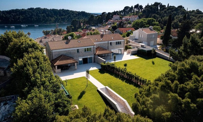 This brand new property enjoys an elevated position with beautiful views of the bay and features 3 bedrooms with en-suite bathrooms, a large swimming pool, and a wine cellar. This property is special because it is fully surrounded by green grass gardens and pine trees along with a beautifully designed interior. It is a few minutes walk from the Cavtat riviera full of cafés and restaurants, as well as local public beaches. Electric bicycles and a Vespa are at guests' disposal during the stay to explore Cavtat.