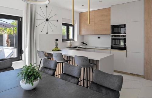 This modern villa features 5 spacious bedrooms and 5 elegant bathrooms, making it ideal for families or groups of friends. Enjoy complete privacy and luxury – with a relaxing jacuzzi and a fully equipped gym for those who wish to stay active during their vacation.