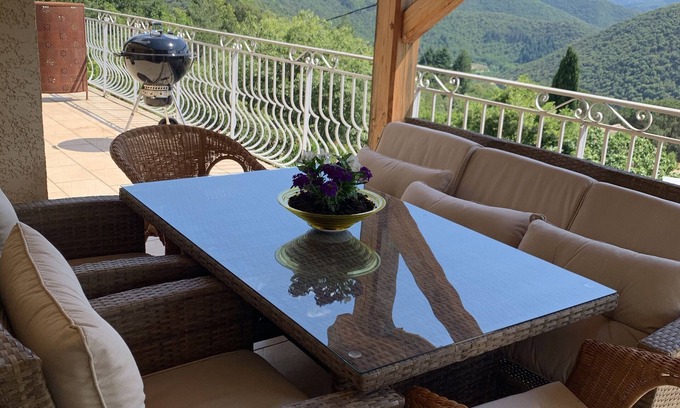 Comfortable villa with private pool (heated may/june), secured, panoramic view, come and relax in a peaceful place in the Cévennes near all services, idleness, fishing or swimming in the river and hiking in the mountains. Discoveries of natural places: Caves of the Demoiselles, Cirque de Navacelles, Mont Aigoual, etc ...