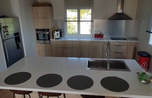 .Kitchen open to the fully equipped lounge area (oven, multifunction microwave oven, fridge with freezer compartment, 4-burner induction hob, extractor hood, dishwasher, Senseo coffee machine, electric kettle, citrus press, electric plancha, fireplace, full table service.