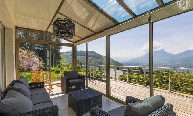 Detached house on 2 levels including an entrance (from the car park, intermediate level between the ground floor and the first floor), comprising on the ground floor: separate kitchen, living room with living room (access by 2 steps), a veranda with living room, a terrace, sauna (shower and washbasin), a bedroom (1 double bed 160x200 cm) opening onto the veranda, a shower room (shower), separate WC with washbasin. Upstairs: mezzanine with lounge area (television with international channels and Netflix access, Bluetooth speaker), 2 bedrooms each with a balcony and 1 double bed 160x200 cm, 1 bedroom (2 single beds 80x200 cm that can be combined with 1 double bed 160x200 cm) , a bathroom (shower), separate WC. Garden. Paved car park. Located 8 km from Chambéry, the house is located in a residential area of a village with shops open all year round. The living area stands out for its luminosity, its large windows opening onto a large terrace with a panoramic view of the Chambéry valley and the surrounding mountains. Like tableaux vivants, the many openings offer a breathtaking view of the landscape. The services are all included with sheets, towels and end of stay cleaning included.