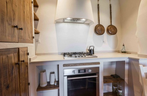 An indoor staircase leads to the first floor, where you\'ll find a cozy living room with a fireplace, dining area, and reading corner. From here, step directly onto a stunning panoramic terrace furnished with a table and chairs, perfect for breakfast with a view or starlit dinners.