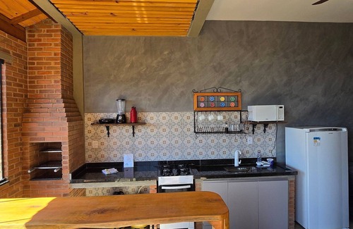 Forget your worries in this spacious and peaceful place. Located 750 meters from the city center, we offer a fully equipped chalet with two bedrooms, one suite, and a shared bathroom, a living room, a full kitchen with a barbecue grill, and a balcony with a beautiful view of the hill and the city center. Parking is available and there's a common area with a garden and fireplace. Come stay at Villa da Serra Ibitipoca.