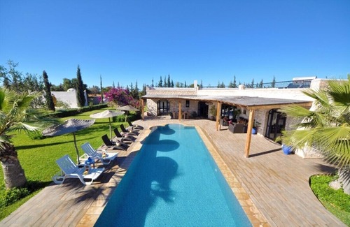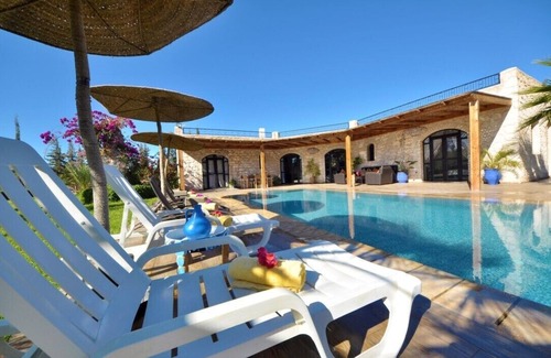 Charming contemporary villa for serene holidays with family or friends, Located at the gates of Essaouira, Only 13 minutes from the city on the road to Agadir, in a very quiet environment and 7 minutes from Sidi Kaouki (wild beach) , near the airport and a few km from Mogador golf course. This villa is built on a closed ground of 3000 M² and the house of 170M², Easy access by very practicable track, It includes 4 beautiful air-conditioned bedrooms with their bathroom, spacious closets (including two bedrooms overlooking the pool) a large living room with fireplace an open fully equipped kitchen, terrace with a beautiful view over nature, a pergola with a comfortable living room and a dining room, A small organic farm, and a plot is beautifully planted, planted with lawns, Beautiful swimming pool with shower independent,