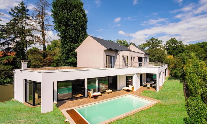 Stay at the Villa de la Mare, a contemporary house of 250 m2 with heated pool, located in Jouy-en-Josas, just 10 minutes from Versailles and 20 minutes from Paris.