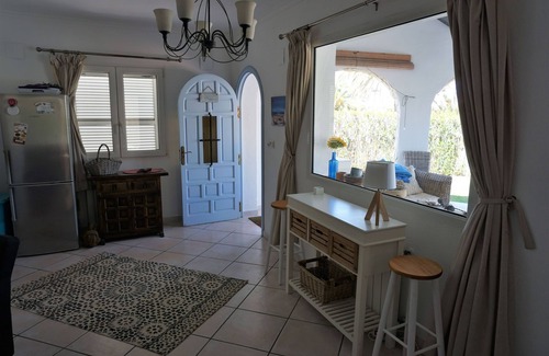 Good location in a residential area at only 50 metres from Els Poblets Almadrava Beach (pepples), the Les Deveses sandy beach is at approx. 300 metres, a 5 minutes walk. There is a restaurant right next door. There is a little supermarket just nearby and diverse restaurants and bars in walking distance. The village centre of Els Poblets is at only 1 km from the villa. There you will find all everydays commodities; various shops, supermarket, restaurants, bars, pharmacy, etc. The city of Denia is at 9 km from the villa and can be reached by car easily within 10 minutes.Denia and its environments provide a very good infrastructure and a huge offer of leisure activities, a mondern Marina and a fishing port, an attractive historic centre and an enormous choice of good restaurants. Last but not least an interesting night live! The diversified 20 km long sandy beach offers something for everyone, water sport activities, calm areas, beach bars, cliffy bays in the nature reserve, great for diving and snorkeling. Denia is situated exactely between Valencia and Alicante, both airports are at about 1 hour 10 minutes driving by car. Within 20 minutes to max. 1 hour you can reach several other lovely places on the coast, i.e. Javea, Calpe, Altea, Benidorm, an Alicante in the south, as well as Oliva, Gandia and Valencia in the north. Also a trip to the back country is worth to do, you will see lots of orange groves, almond trees and quaint villages between green hills and mountains. There are 2 renowned golf courses at only 10 km from the villa: La Sella and Oliva Nova Golf.