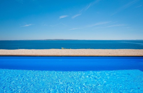 The kitchen is fully equipped and has a breakfast bar. The airy living area has an angled furniture arrangement, a flat TV, and air conditioning and exits to a terrace with a pool. The dining room is in a separate room next to the kitchen, which offers a beautiful sea view and an exit to the pool.