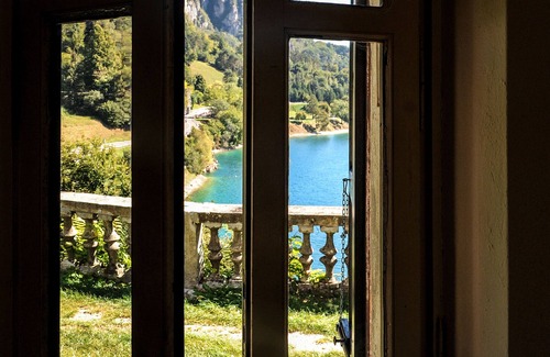 The Villa Dianella is 'the castle', historic home from the 900, has a unique charm, in a privileged position overlooking the lake of Ledro. It offers the widest part of the castle that overlooks the lake. On the ground floor is a study, a dining room and a living room with fireplace (pellet stove and TV), bathroom and kitchen with exit to the garden. A staircase leads to the first floor where there are two double bedrooms and a bathroom, a spiral staircase leads up to another level of the castle, where there are another two double bedrooms and one single and two bathrooms.