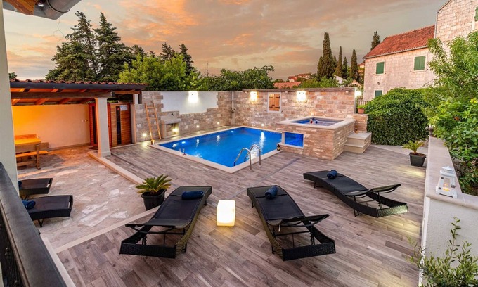 Perched atop island of Brač, this charming villa offers stunning panoramic views of the island's western side. Built before 1890, it blends traditional stone architecture with modern, elegant design. The villa spans 190 m² and comfortably accommodates up to 10 guests. It features four bedrooms—two on the ground floor and two in a stylish gallery—along with two fully equipped kitchens, two inviting living rooms, and three spacious bathrooms. Outdoors, enjoy a heated pool with a generous sun deck, a jacuzzi, and a sauna for ultimate relaxation. Two covered terraces provide space for dining and lounging, while the outdoor barbecue invites you to savor alfresco meals in the tranquil setting. With its mix of historical charm, modern comfort, and breathtaking views, this villa is a perfect getaway on the beautiful island of Brač.