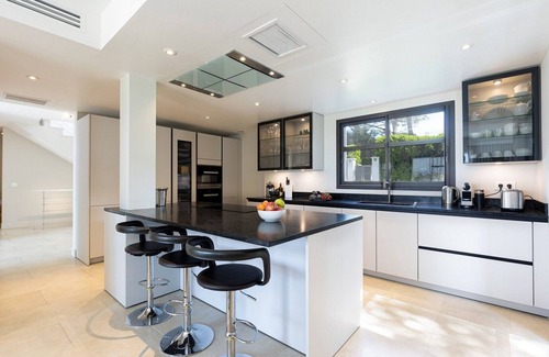On the garden level guests have access to a second living room with flat screen TV, one en suite bedroom with king size bed and one with queen size bed and en suite shower room, opening onto the pool terrace and garden. An additional single bedroom suite with small kitchenette is ideal for staff or teenagers.