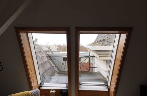 Attic in mod./ San. Gründerzeit villa (monument) with roof terrace and view over the roofs of Stade. Absolutely quiet location with garden. 5 minutes walk to the train station and the old town of Stade. Shops within 100 m (Edeka, bakery, Chinese, pharmacy). At fitter and craftsmen groups is not rented.