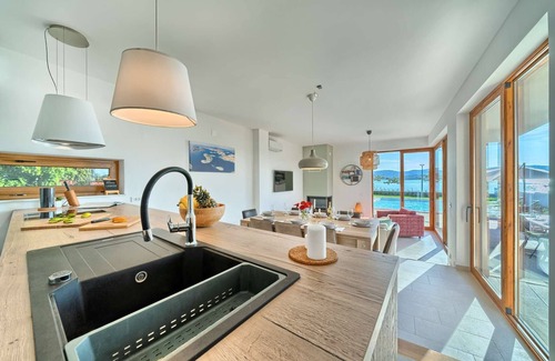 Recently built and equipped with modern furnishings and contemporary amenities Villa Elements is an ideal choice of a holiday for families with children or a group of friends. Spacious bedrooms located on the first floor provide plenty of privacy while the ground floor with a cozy lounge with a fireplace and a fully equipped kitchen humbly impress with views of the sea, reachable within a few meters. From here the sliding door allows access to the deck equipped with a 32 m² heated pool, alfresco dining table with barbecue facilities, a fire pit, and comfortable lounge seating perfect for enjoying warm evenings while admiring sunsets. Sun loungers with parasols surround the pool providing shade from the hot summer sun, while the green lawn makes a lovely area for children to play. Pool table, Dalmatian Balota and bicycles are available for your use.